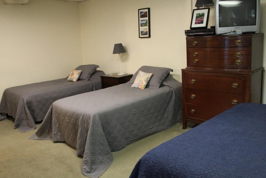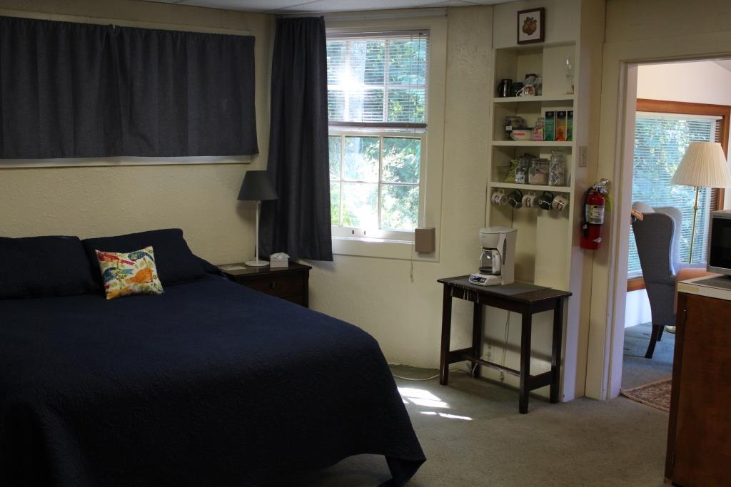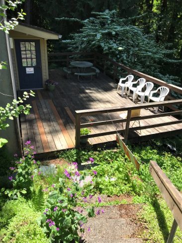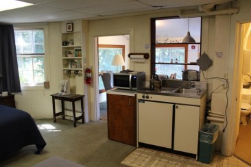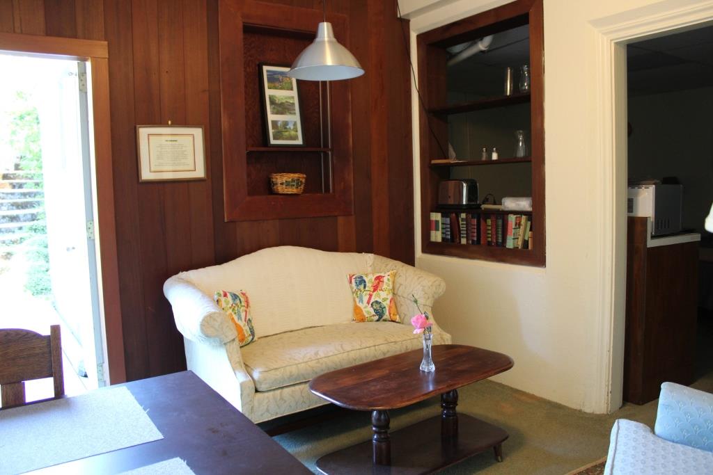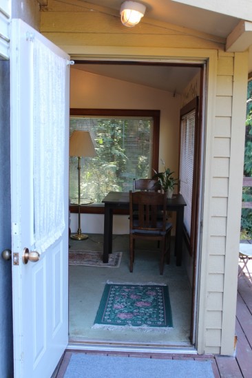 Complete with a large outdoor deck, it is furnished with a queen bed, two twin beds, and has a small kitchen for doing one’s own cooking (dishes provided). There are numerous teas, coffee and cocoa available for that nice warm cup in the morning…or evening…and a cozy sitting area for reading or study with a large window nearby. For nice sunny days, the deck is a relaxing spot.