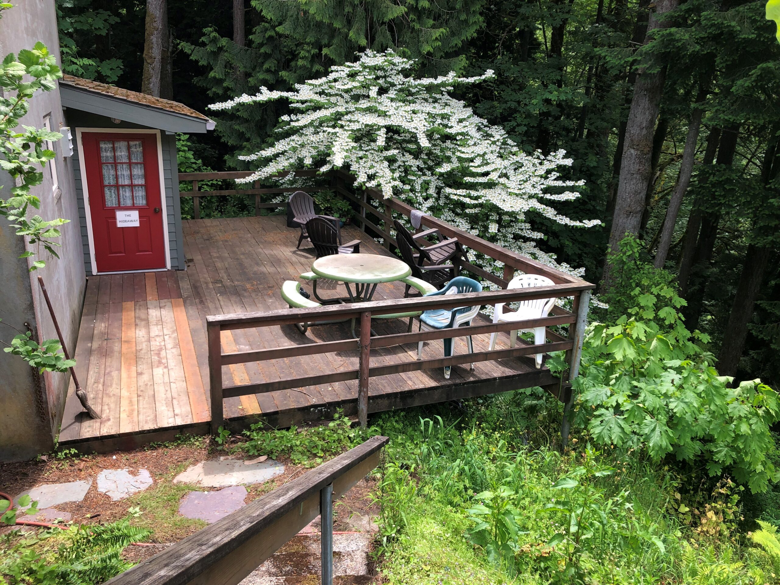Accessibility alert: We regret that the Hideaway is not wheelchair accessible. To reach the Hideaway’s entrance, guests must walk down a long flight of outdoor stone steps. Guests with mobility issues are advised to choose other Menucha accommodations.