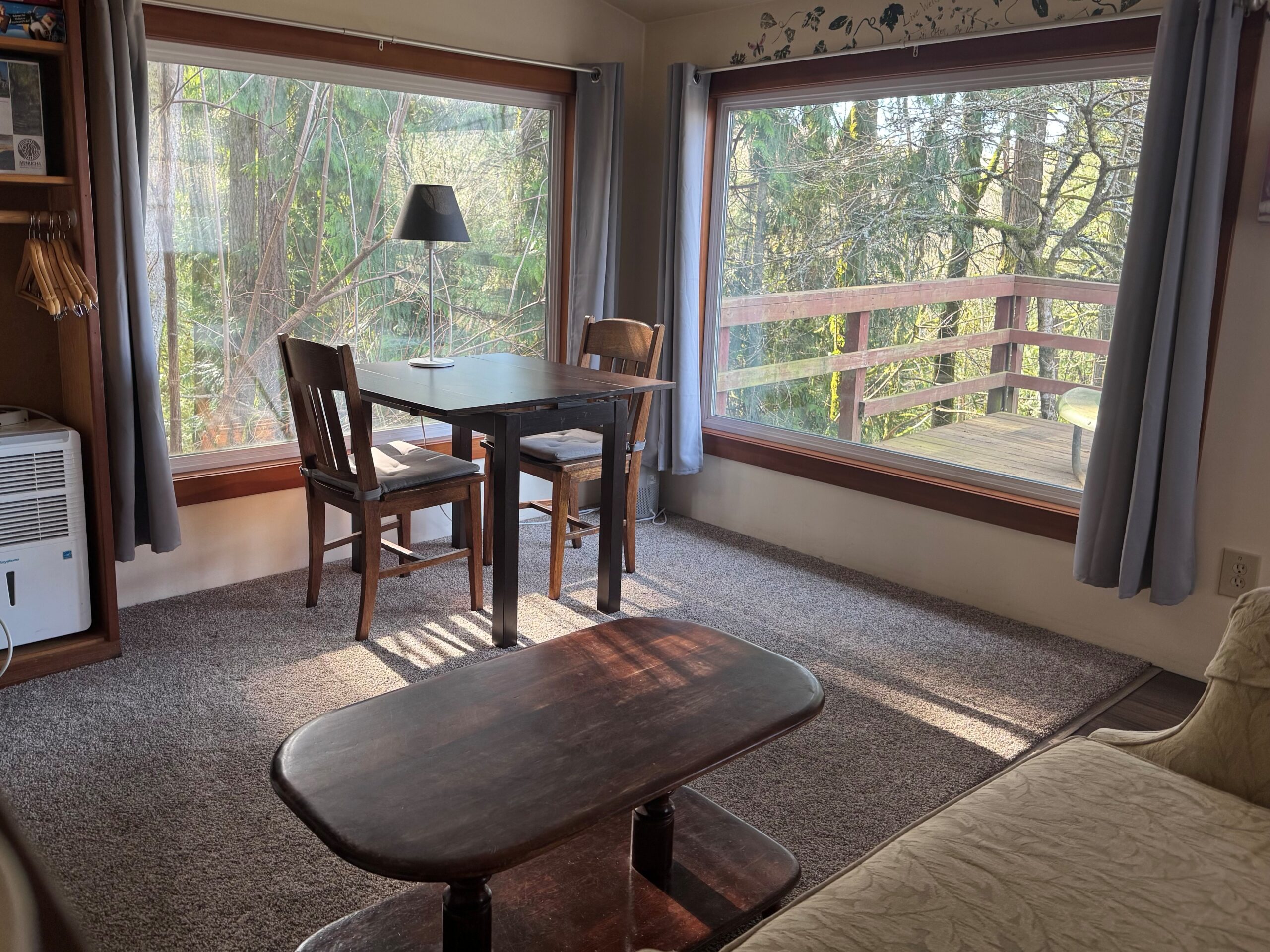 Complete with a large outdoor deck, it is furnished with a queen bed, two twin beds, and has a small kitchen for doing one’s own cooking (dishes provided). There are numerous teas, coffee and cocoa available for that nice warm cup in the morning…or evening…and a cozy sitting area for reading or study with a large window nearby. For nice sunny days, the deck is a relaxing spot.